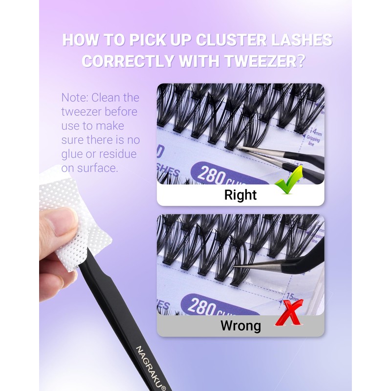 - Professional Eyelashes Extension: As a professional eyelash designer brand, we are committed to providing chic products, aimed at adding more glamour to our customers. NAGARAKU provides everything you need for DIY lash extensions, including clusters, lash tweezers, lash bond and seal, lash glue and removers. Come try a new way of DIY eyelashes with us that brings you salon quality while saving you time and money.