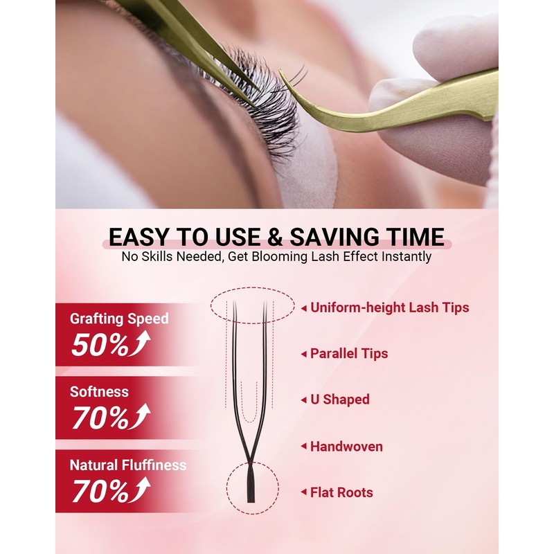 - UNIQUE LOOK: Special U shape makes lash extensions look more fluffy and elegant. The 2 sides of the eyelashes are parallel, and the U-shaped structure fits the natural eyelashes more closely. The fans shape is smaller and more compact, making it light, comfortable and with less burden.