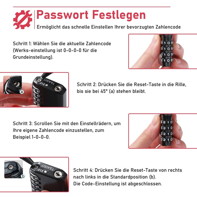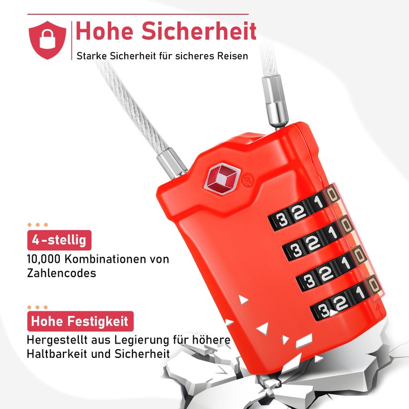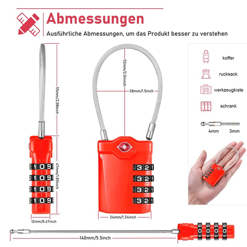 - 4. Versatile: the 140 mm long flexible cable of this combination lock 4 digit is long enough to secure multiple zips at the same time, e.g. suitcases, backpacks, luggage, sports bags and briefcases. The cable lock combination lock also fits on lockers in the gym, tool boxes, gun cases, etc.