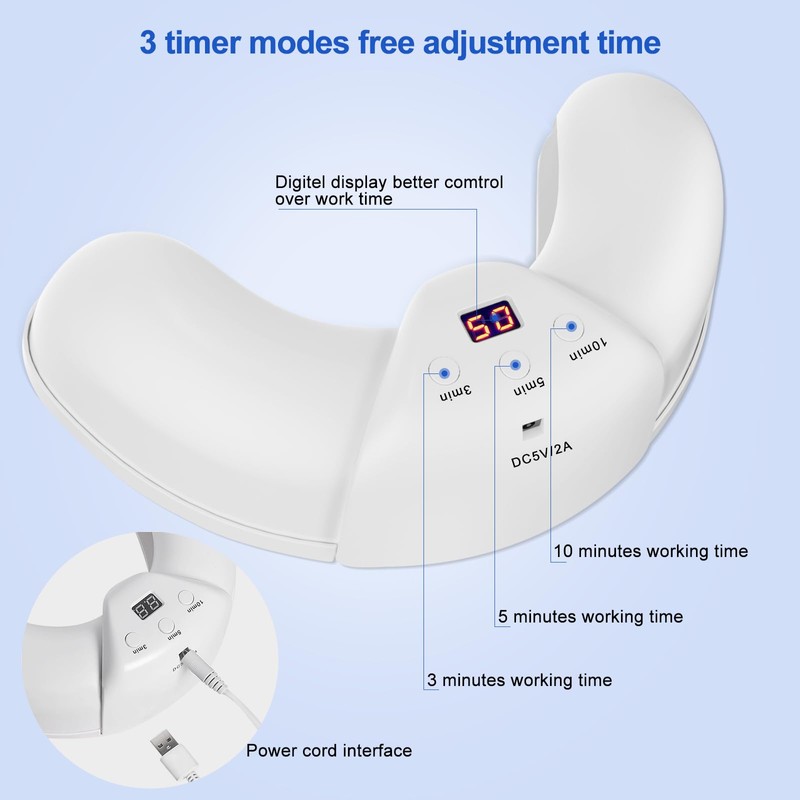 - Zeitanzeige: Mit einem digitalen Bildschirm, der die verbleibende Nutzungszeit anzeigt, stehen 3, 5 und 10 Minuten Arbeitszeit zur Auswahl, sodass Sie die Zeit bequemer und genauer verfolgen können. Wenn die Zeit abgelaufen ist, schaltet sich die LED automatisch aus.