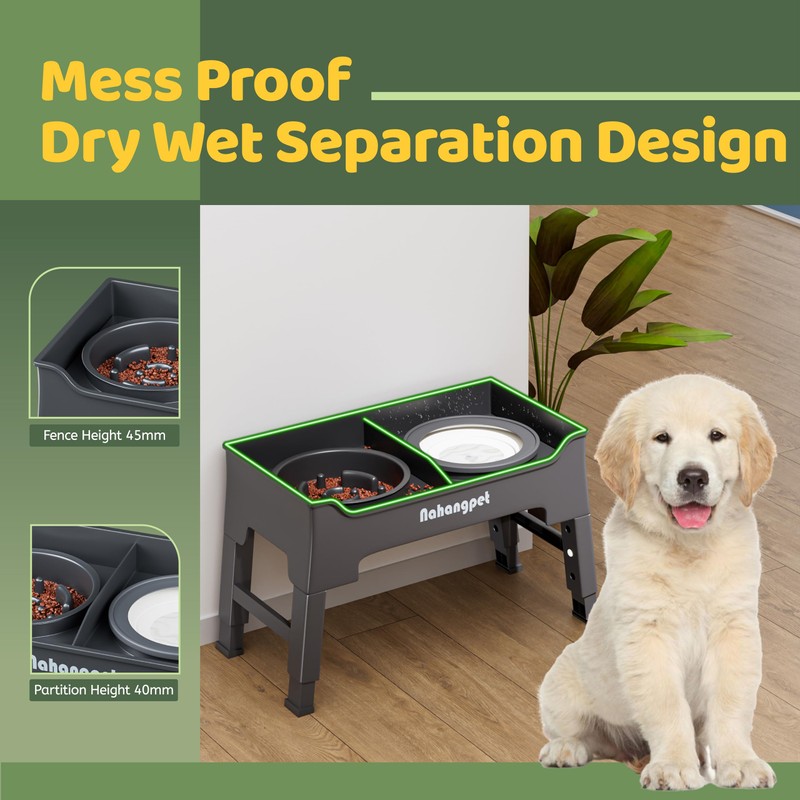 - Mess Proof Design: The 45mm high edges around prevent splashing and prevent food from spilling. The middle partition between the two bowls is 40mm high, which can effectively remove splashed food and water. The bottom has an anti slip pad to ensure stability during eating. The whole set is easy to clean.