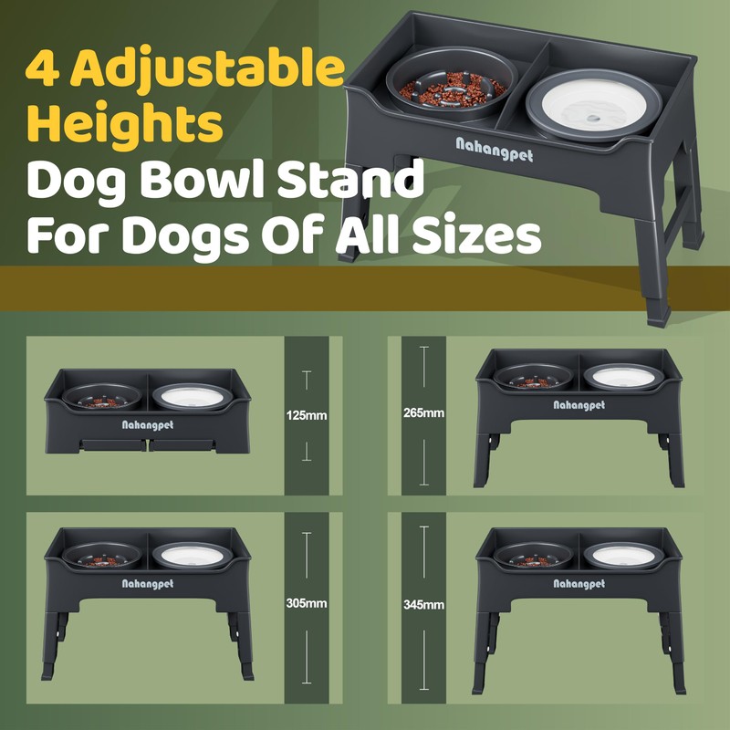 - 4 Adjustable Heights Dog Bowl Stand for Dogs of All Sizes: No need to bend down anymore. Our elevated dog bowls are designed to accommodate dogs of all sizes and stages of life. With 4 different heights options, you can easily adjust the bowl stand to suit your puppy or senior dog’s needs. Choose from heights of 4.92-inch, 10.43-mm, 12.01-inch, and 13.58-inch.