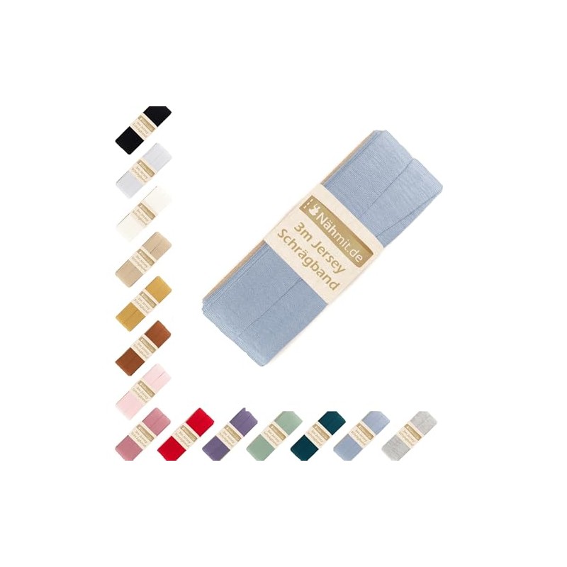- Nähmit - Jersey Bias Binding - Here comes the edging band for clothing! This high-quality jersey hem band is already pre-folded and is wonderfully suitable for clean processing of arm and neckline edges on T-shirts, sweaters and much more. Since the fabric of this tape is already elastic, the jersey hem tape is cut with a straight thread course and not like the cotton bias binding with a slanted thread gradient.
