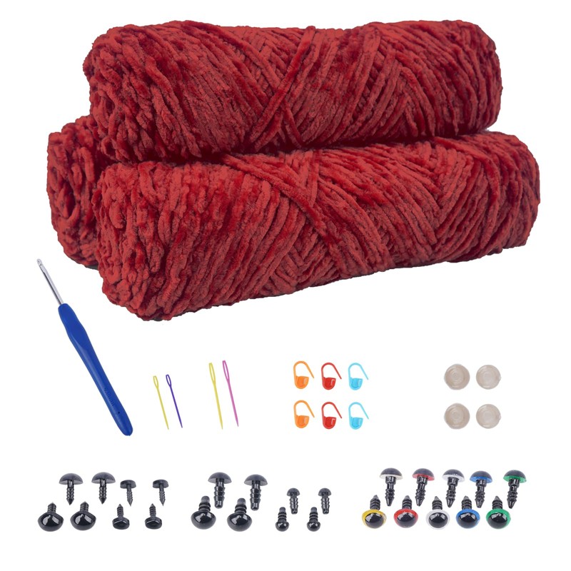 NAHUAA 3 x 100g Chenille Chunky Yarn Red Soft Velvet Crochet Fluffy Yarn for Knitting and Crocheting with Needles/Eyes/Noses for Beginners for Clothes, Scarves DIY