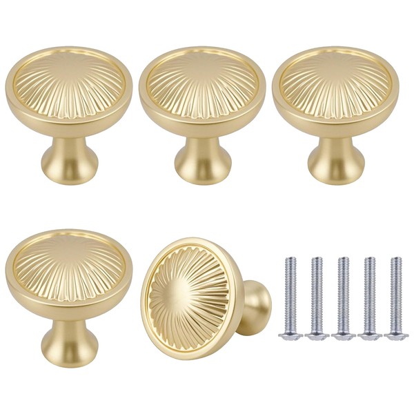 NAHUAA 5pcs Gold Cabinet Knobs 30mm Round Solid Drawer Knobs Single Hole Kitchen Cupboard Door Handles and Knob with Screws for Bedroom Bathroom Chest of Drawer Wardrobe Furniture