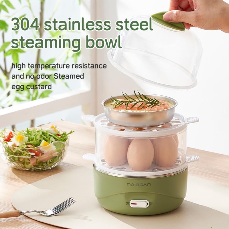 - Capacity: Single-layer can hold 7 eggs, Double layer can hold 14 eggs, A 200 ml stainless steel steaming bowl.