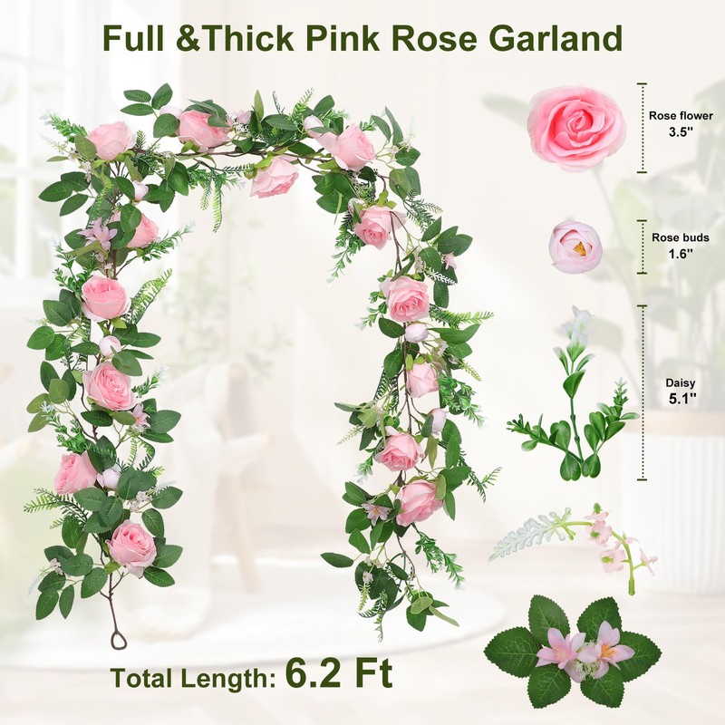 - [🌷Pretty Pink Flower Garland]: This rose garland is made up of richly sized 14 rose flowers and 8 buds, daisy, plentiful kinds of leaves. The pink flowers and buds feature a stunning array of bright, elegant and holy; The rose vine leaves are full of luster, clear veins. The garland shape is very natural, vibrant and looks close to real. It adds a lively and dazzling spring touch to the season's decorations. A natural and realistic accent that radiates warmth and full of vigor.