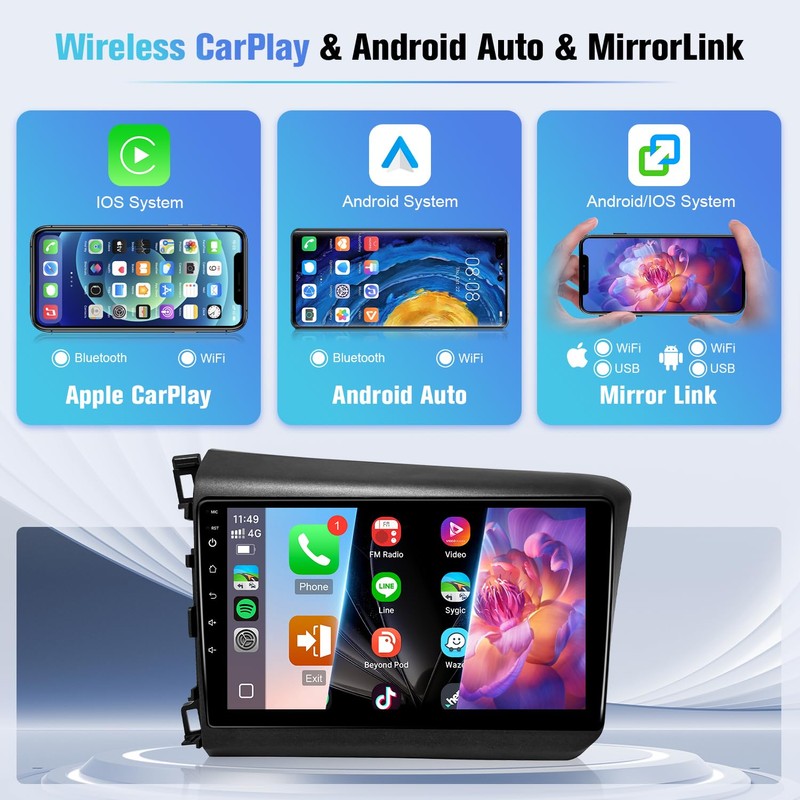 - 【Wireless Carplay & Android Auto】This Naifay stereo for 2012 Honda Civic radio upgrade replacement is compatible with wireless apple CarPlay and Android Auto. Just connect via Bluetooth & WIFI, you can make calls hands-free with the help of Siri or Goo-gle assistance, easy to get phone contacts, emails, notifications, map navigation, music, videos and more. It means that you can focus more on road safety while driving!