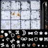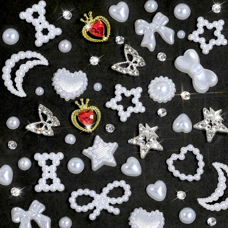 3D Nail Charms Assorted pearls gems and rhinestone nail charms, including moon, heart, bow, and hollow bow star pearl nail charms; heart, planet, butterfly alloy nail rhinestone charms; semi-circular flatback pearls,which can satisfy your various DIY designs needs