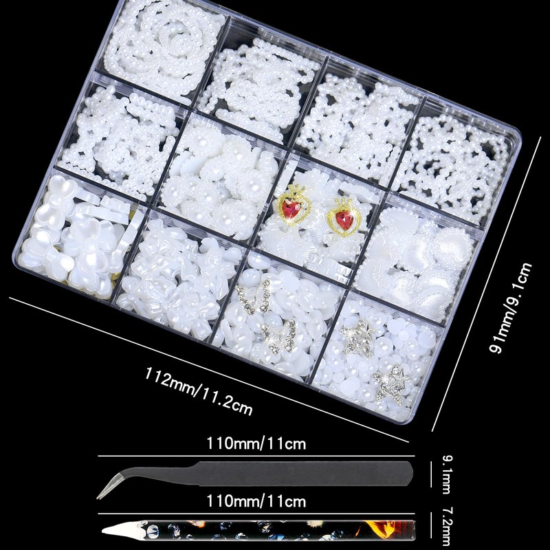 - Pearls for Nail Charms:You will get a box of white multi styles 3D nail art different styles charms and butterfly, planet, heart nail gems charms and flatback half round pearls,a pc of tweezer and a pc of pickup pencil.