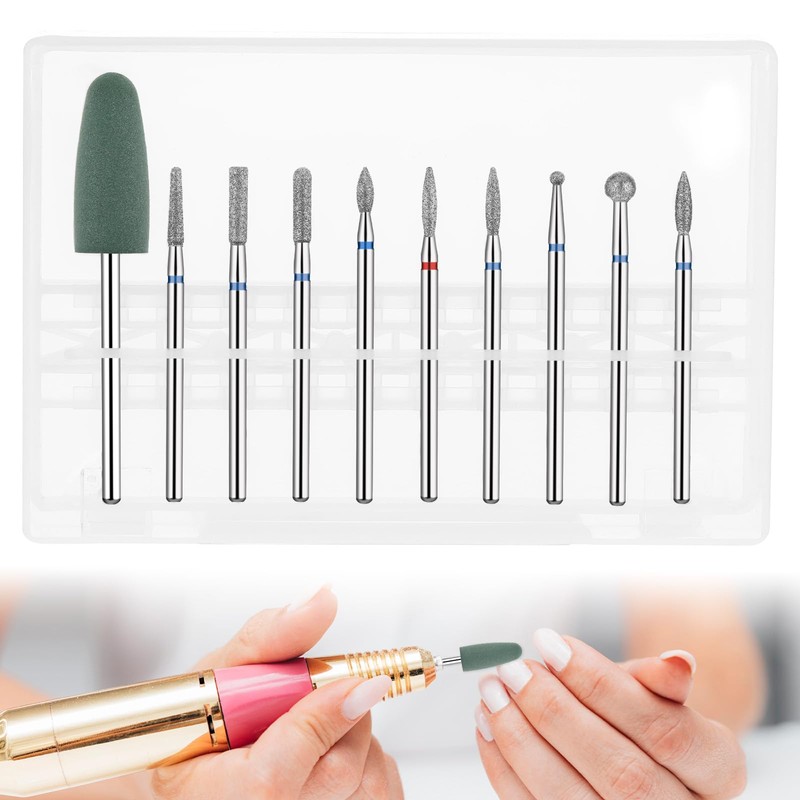 - 10-in-1 Versatile Drill Bit Set: Includes 10 bits, such as a cuticle drill bit, grinding, polishing, and shaping heads for cuticle care, dead skin removal, and nail extensions.Clear visual markings for quick identification, streamlining your nail art workflow