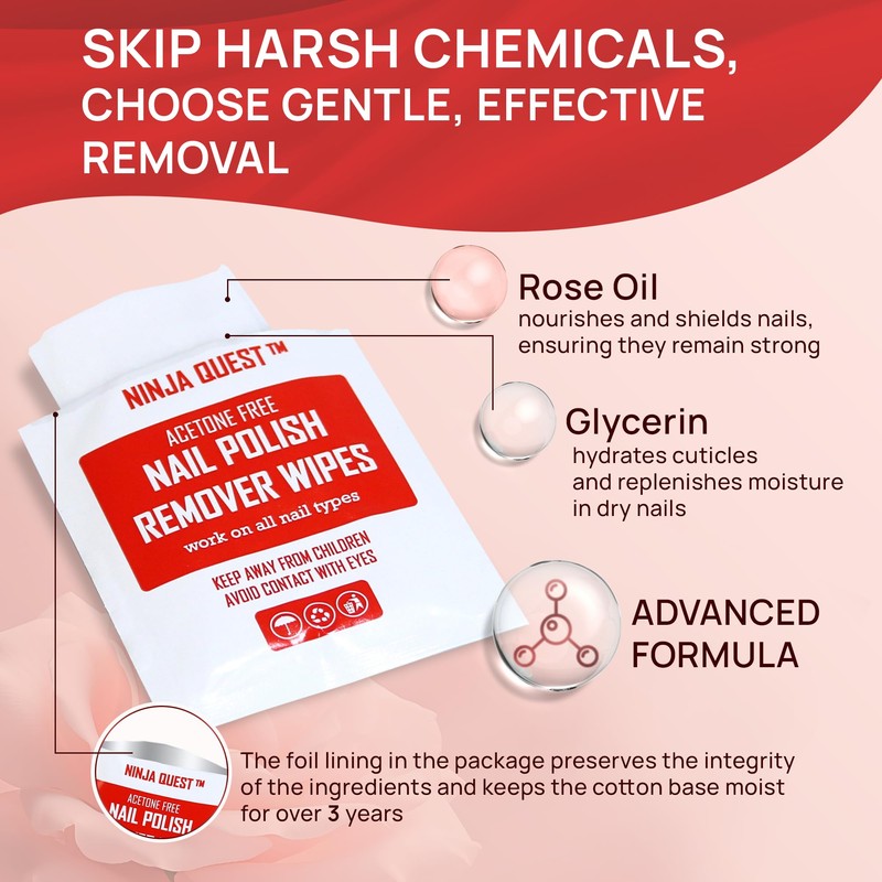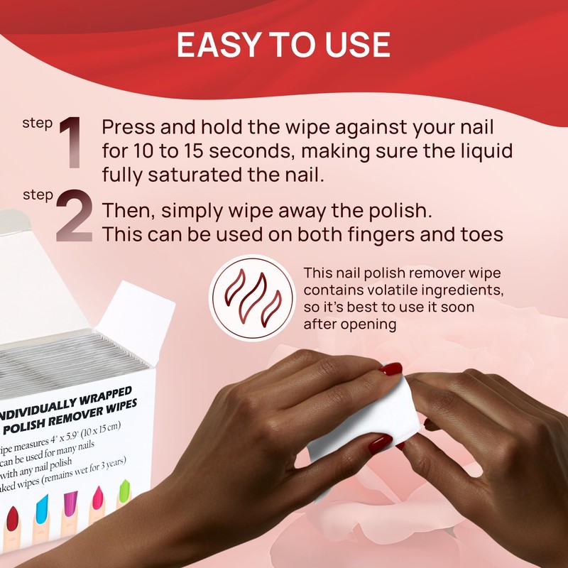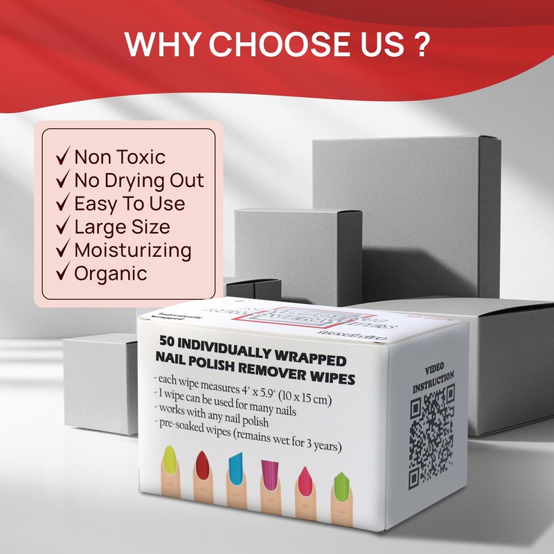 Nail Polish Remover Pads - 100% Non-Acetone - 50 Pack Bulk Set - Individually Wrapped - Quick Nail Polish Remover Wipes - Fingernail Travel Kit to Clear Nail Polish for Home & Professional Removal
