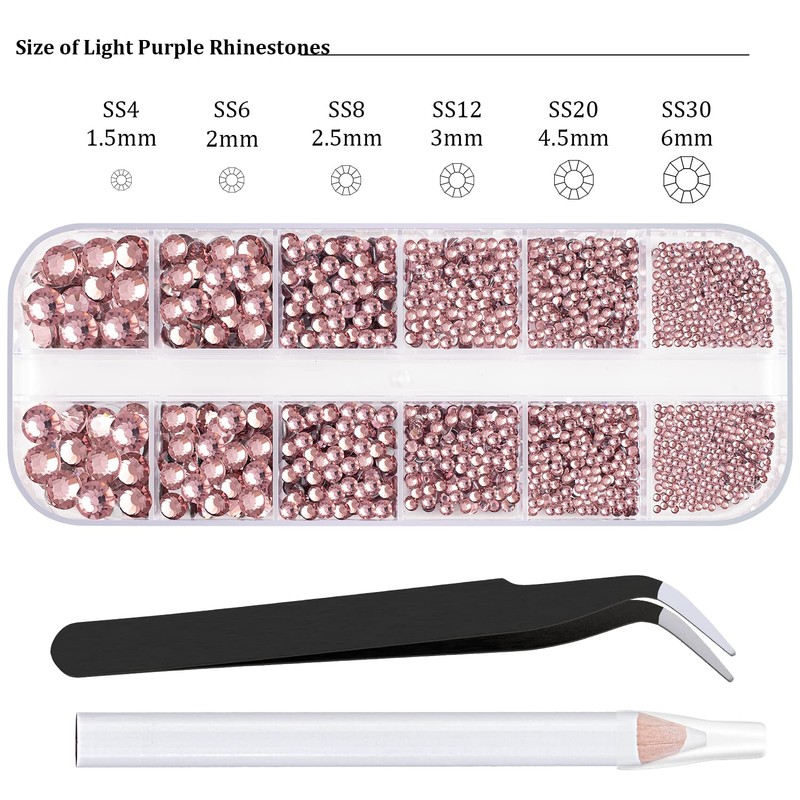 - YOU WILL RECEIVE:1 Box of flatback nail art round light purple rhinestones with 6 sizes: 1.5mm, 2mm, 2.5mm, 3mm, 4.5mm, 6mm; 1 Pc of rhinestone picker pencil; and 1 Pc of tweezer for picking up gem stones. This is perfect for both nail tech and art deco