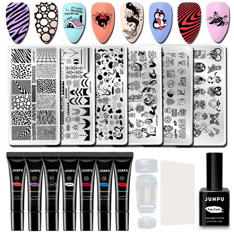 - Gel Nail Stamping Kit Include: 6pcs geometric nail stamping plates(Size:12 cm*6 cm (4.7 inch*2.4 inch))+7 Colors Nail Stamping Gels(8ml/0.25fl.oz per tube)+1 Double headed clear french nail stamper with Scrapers+1pcs top coat(12ml/0.4fl.oz). This is an interesting nail stamper kit has everything you need to create stunning and intricate nail designs with ease