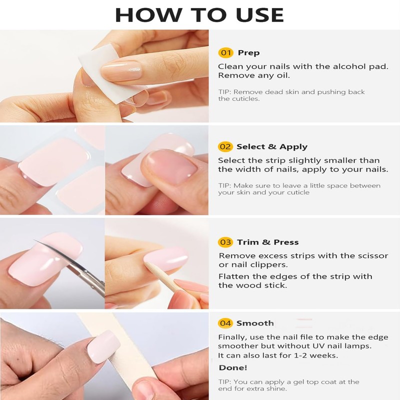 Application is simple with the included kit - just clean your nails, select and apply your size, trim excess, and smooth the edges.