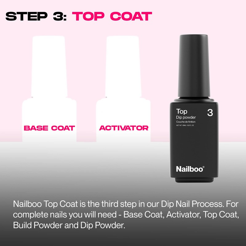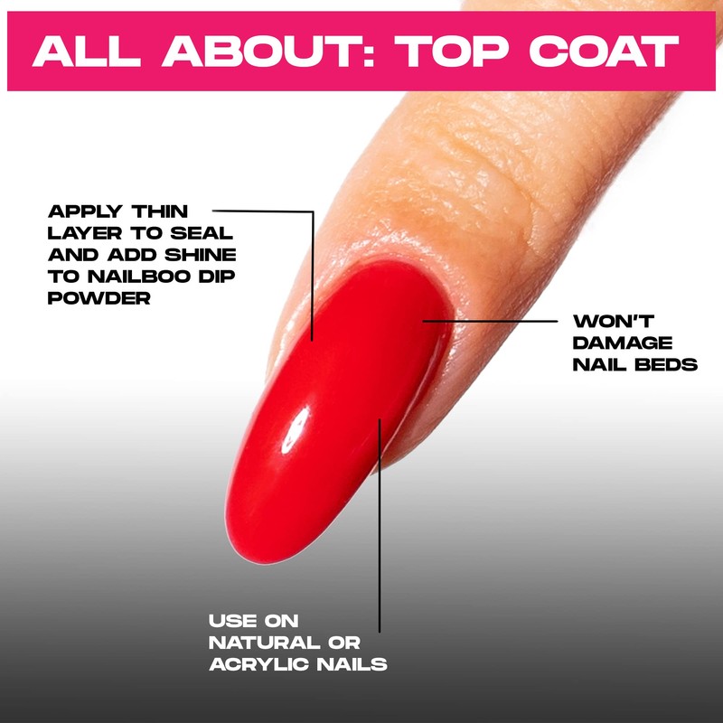 - DIP TOP COAT: Nail Top Coat is the last step in the powder application process to seal everything in, add shine, and protect nails from the sun's UV rays. New to the Nailboo fam? Make sure you have our other essential liquids, build and nail dip color powders (not included) to complete your customized manicure.