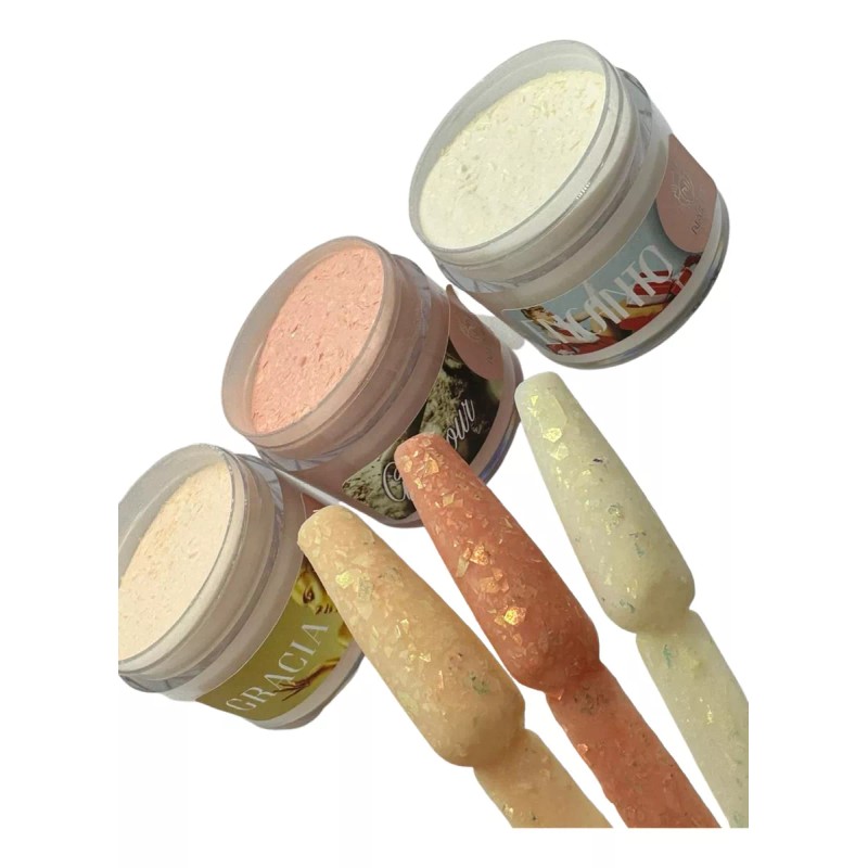 Colección de 3 acrílicos, de 50 grs cada bote, hermosos tonos con decoración, aumenta tus diseños con esta colección llena de decoración, al combinar con los demás productos de la familia Nailux obtendrás hermosos resultados con un manejo fácil, vive la experiencia Nailux y Siente la Diferencia