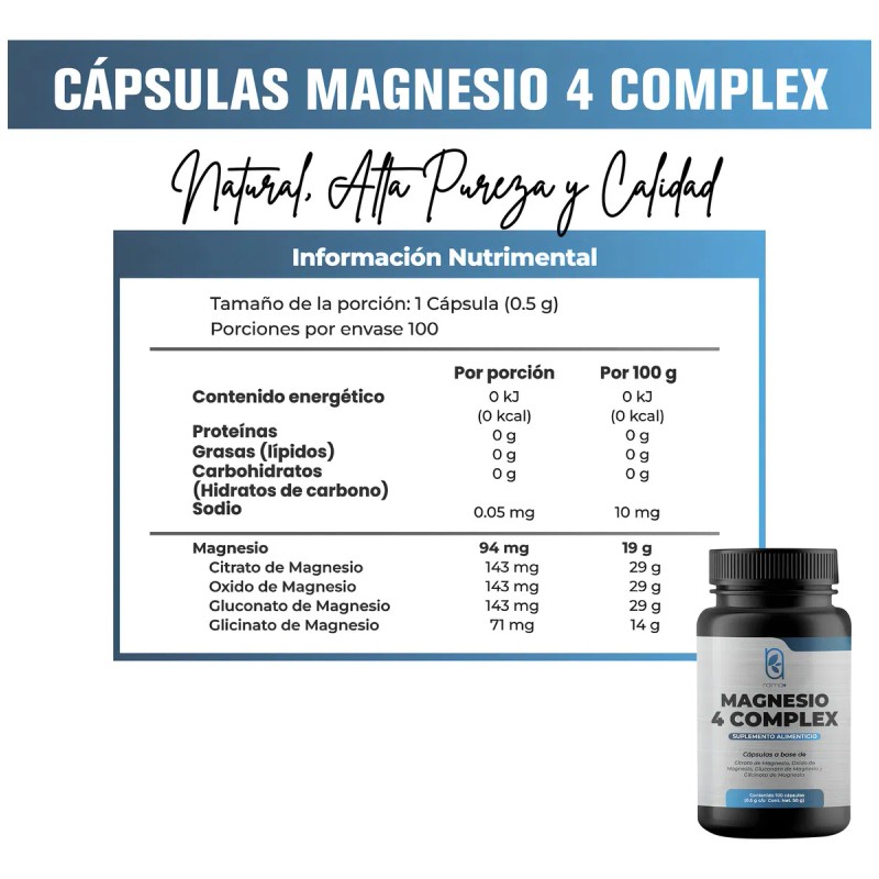 - Fórmula Completa: Cada cápsula contiene 500 mg de Magnesio 4 Complex, que combina Citrato, Glicinato, Óxido y Gluconato de Magnesio para una absorción y efectividad óptimas. Energía y Bienestar: Apoya los niveles de energía óptimos, promoviendo la relajación y el bienestar físico y mental. Calidad del Sueño: La importancia de la calidad del sueño, permite un mejor descanso para realizar de manera efectiva todas las actividades del día. Fácil Absorción: Formulado para garantizar una alta biodisponibilidad, aprovechando al máximo los beneficios de cada tipo de Magnesio. Sin Aditivos: Cápsulas puras sin rellenos ni conservantes, perfectas para quienes buscan un suplemento natural de alta calidad. Apto para todas las dietas. Presentación: 100 cápsulas, Cont. Net. 50g Modo de Empleo: Tomar 1 cápsula una vez al día con los alimentos. Precaución: Este suplemento no sustituye una dieta balanceada. Mantener fuera del alcance de los niños. Consulta a un médico antes de iniciar cualquier suplemento, especialmente si estás embarazada, amamantando o tienes alguna condición médica. Aviso legal
