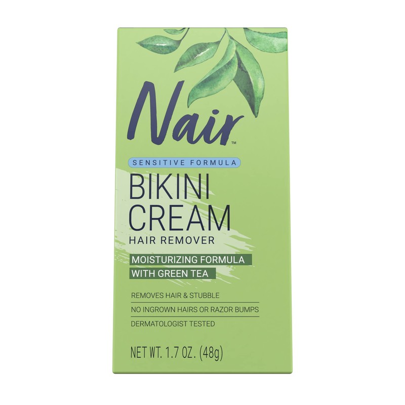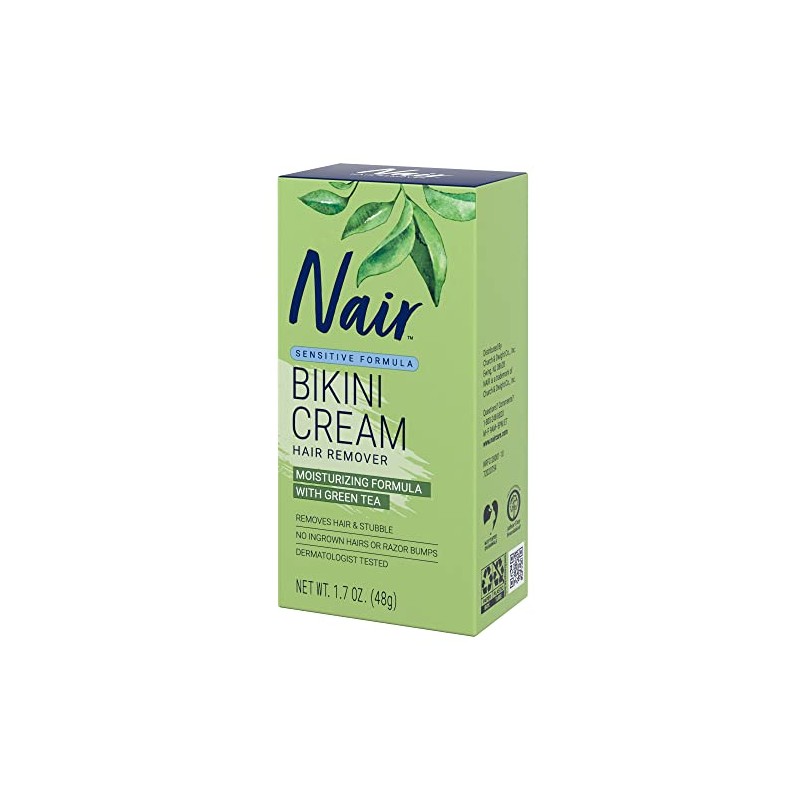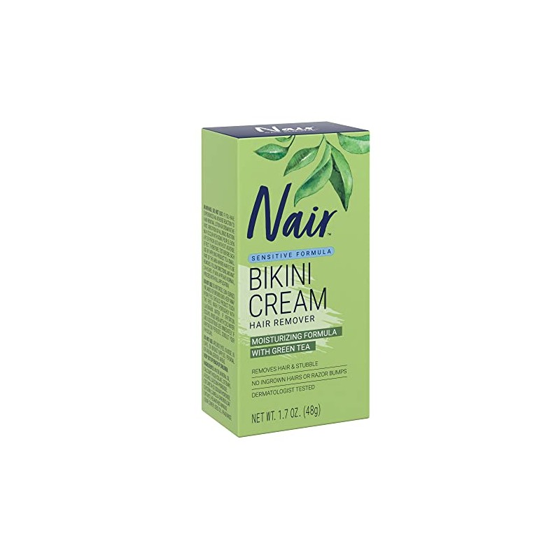 Nair Hair Remover Sensitive Formula Bikini Cream Hair Removal gently and quickly removes hair from the pubic and bikini area without nicks, cuts or razor bumps. This dermatologist-tested cream delivers powerful body hair removal, helping you stay smooth for days longer than shaving. Infused with green tea extracts, this bikini hair remover leaves your most tender skin soft and smooth. Fast and easy, Nair sensitive skin depilatory cream thoroughly removes body hair below the skin's surface for effective bikini area hair removal that leaves skin feeling smooth. To remove hair, apply a thick, even layer of this painless hair remover to desired areas. Leave the cream on for 6 to 10 minutes depending on hair thickness, then gently wipe off the cream and hair with a damp washcloth. Once all hair has been removed, rinse skin thoroughly in the shower and pat dry. It's that easy! Make sure to patch test before using. Trusted since its introduction in 1940, Nair has always been a leader in hair removal. Nair offers a full range of high-quality, easy-to-use hair remover products. Our made-for-everyone, multitasking, magical formulas give you hair-free, carefree skin that lasts days longer than shaving. Because everyone deserves to feel amazing in their own skin.