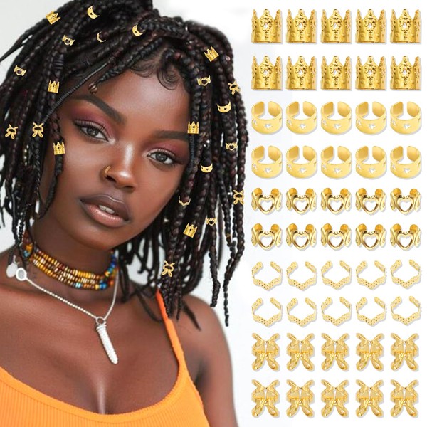 NAISKA 50Pcs Gold Hair Jewelry for Braids Multi Style Loc Dreadlock Accessories Adjustable Braid Jewelry Crown Hair Cuffs Non-Piercing Ear Clips Decorations for Women and Girls