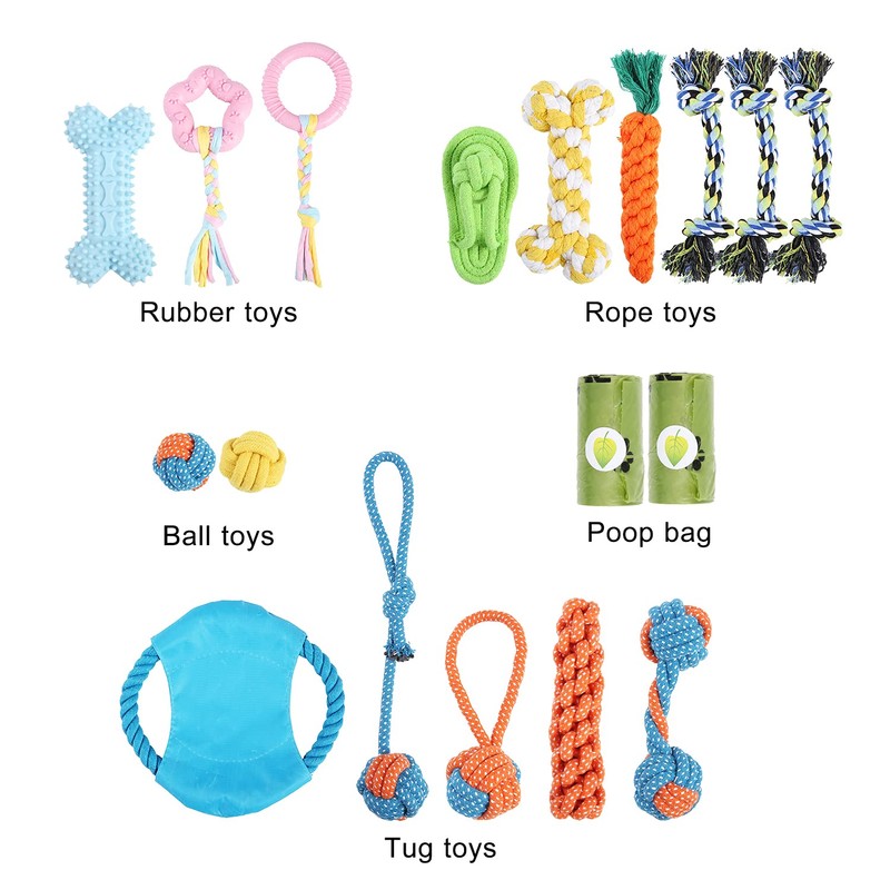 - 【18 Pack various funny Toys】Big value variety of dog toys for puppies small medium dogs with anxiety dogs. Including:4 Dog Tug Toys,2 Dog Ball Toys,3 Dog Chew Toys, 6 Dog Rope Toys,1 Dog Bone Toy and 2 Dog Poop Bags. Not recommended for the sharp teeth dogs and aggressive dogs.