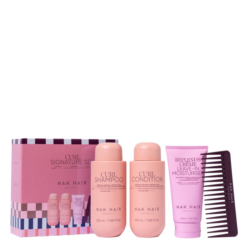 The NAK Signature Holiday Curl Trio Pack is the ultimate hair care solution for curly hair enthusiasts. This exclusive trio pack is designed to enhance and maintain the natural beauty of your curls. It includes a carefully curated selection of products that work together to cleanse, condition, and nourish your curls, leaving them soft, defined, and full of life. Perfect for those who want to embrace their curls with confidence, this pack offers a complete hair care routine that caters specifically to the needs of curly hair. What is included in NAK Signature Holiday Curl Trio Pack? • Curl Shampoo 350ml • Curl Condition 350ml • Replends Creme Leave In Moisturiser 150ml • Bonus Comb What are the features and benefits of NAK Signature Holiday Curl Trio Pack? Curl Shampoo 350ml: This gentle shampoo is formulated to cleanse curly hair without stripping away its natural oils. It helps to enhance curl definition and reduce frizz, leaving your hair feeling refreshed and revitalized. Curl Condition 350ml: A nourishing conditioner that provides intense hydration to curly hair, helping to detangle and soften each strand. It enhances curl elasticity and bounce, ensuring your curls look vibrant and healthy. Replends Creme Leave In Moisturiser 150ml: This leave-in moisturizer delivers long-lasting moisture and protection to your curls. It helps to reduce frizz, add shine, and improve manageability, making it easier to style and maintain your curls throughout the day. Bonus Comb: The included comb is perfect for detangling and styling your curls, ensuring they remain defined and tangle-free. Who is NAK Signature Holiday Curl Trio Pack for? This product is for anyone with curly hair looking to enhance and maintain their natural curls with a complete hair care routine.