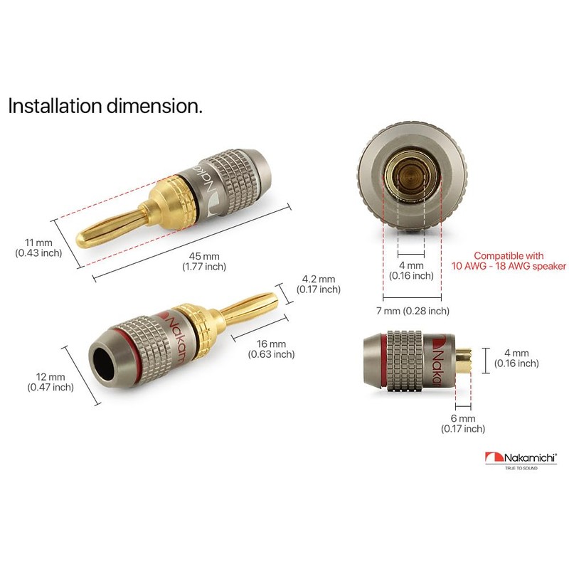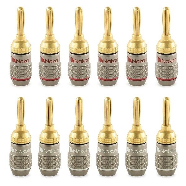 - ✅ Nakamichi FanLock Excel Series Banana Plug comes with 3 year warranty and supports 10AWG - 18AWG speaker cable. This package comes with 12 pieces (6 pairs) banana plugs.