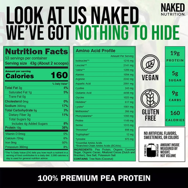 - NAKED MEANS NOTHING ARTIFICIAL: Pea Protein from US and Canadian Farms, Organic Coconut Sugar, Organic Cacao, Alkalized Cocoa (Dutch and Brazilian), Sea Salt, Potassium Salt. That's it. Naked Pea contains no artificial sweeteners, artificial flavors, or colors and is GMO-Free, Soy Free and Gluten-Free.