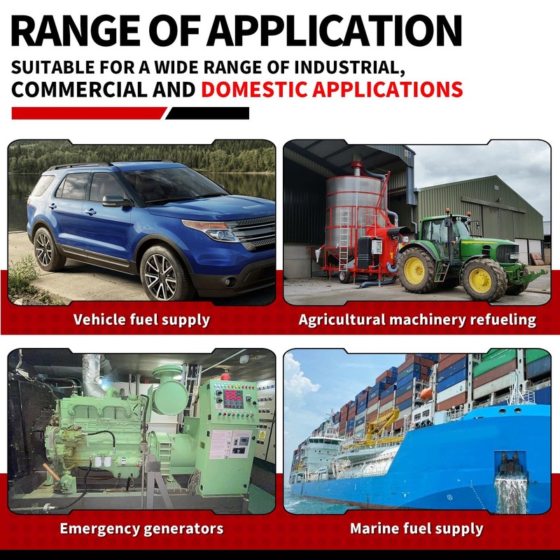 - 5) Wide Range of Uses: The electric oil transfer pump suitable for a wide range of industrial, commercial and domestic applications, whether it is vehicle fuel supply, agricultural machinery refueling, emergency generators, Marine fuel supply, the fuel pump ensures efficient and stable procedure and provides continuous power to your equipment, the fuel pump can be used to transport gasoline, diesel, kerosene, mineral oil and similar fuels or oils.