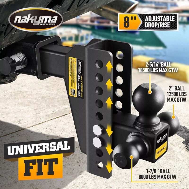 - [OUTSTANDING LOAD CAPACITY] - Nakyma drop hitch has been professionally tested and evaluated, the 1-7/8-inch hitch ball is rated at 8,000 pounds (GTW), the 2-inch hitch ball is rated at 10,000 pounds (GTW), and the stronger 2 5/16-inch ball is rated at 12,500 pounds (GTW), fits most Class III/IV hitches, and is designed to meet 99% of common towing needs. And it's built to last.