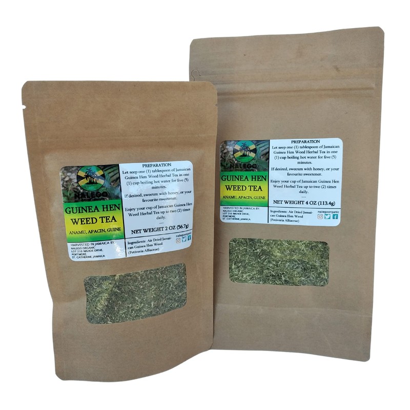 Jamaican Guinea Hen Weed Tea - (Organic Wildcrafted) [Petiveria Alliacea] Sizes 2 Oz Package 4 Oz Package Source Our Jamaican Guinea Hen Weed was harvested by hand from its natural tropical environments in the cool hills of Jamaica. The plant was partly cut, to ensure its continued growth and survival, washed, and air dried in a controlled environment to maintain its nutritional value. The plant is then processed in an accredited mill into tea powder. Preparation Add one (1) tablespoon of Nalego’s Organic Jamaican Guinea Hen Weed Tea to one (1) cup of boiling hot water and let seep for 5 minutes. Enjoy up to two (2) times daily. Description Jamaican Guinea Hen Weed wild- harvested in the hills of Jamaica, is a powerhouse of minerals and nutrients. Researched Benefits Jamaican Guinea Hen Weed (Petiveria alliacea) or Anamu - leaves, stems and roots - is widely used in Jamaica due to its extensive catalogue of health benefits. Some of these benefits include: It boosts the immune system It is rich in antioxidants. It is used as a treatment for cold and flu symptoms and other respiratory conditions. It is effective in reducing fevers. It is an effective pain reliever. It is a traditional remedy for arthritis and rheumatism — its leaves can be crushed and made into a paste which can be applied to soothe pains and aches. It can also be used to stimulate proper digestion and to relieve digestive problems such as bloating and flatulence. It promotes the release of toxins through increased sweat and urine production.