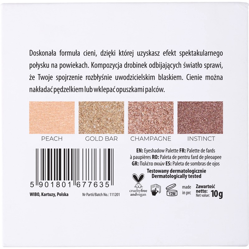 - CREATE & PLAY: Professional eyelid glow has never been so easy to create! A palette of four totally sparkling eyeshadows in the trendiest warm shades: Peach, Gold Bar, Champagne & Instinct, will conjure up every kind of sparkle you dream of in your eye make-up.