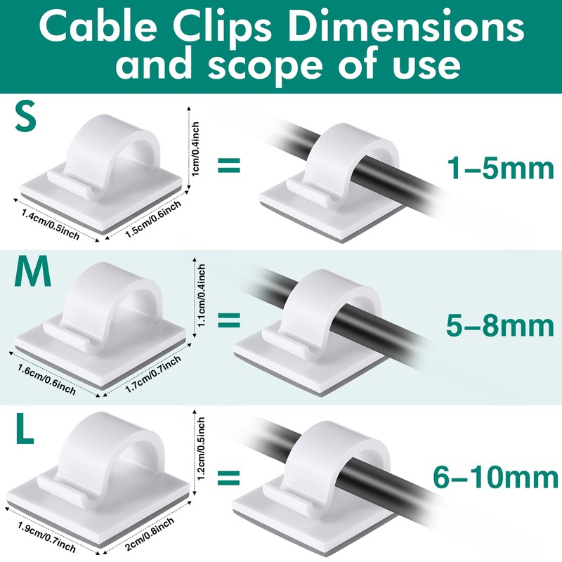 - Size: we offer 3 sizes, you can choose according to your needs, our adhesive cord clips are suitable for most smooth surfaces, including doors, smooth walls, fences, tiles, windows, table, desk (NOT suitable for rough walls, rough wallpaper, brick surface, moist surface