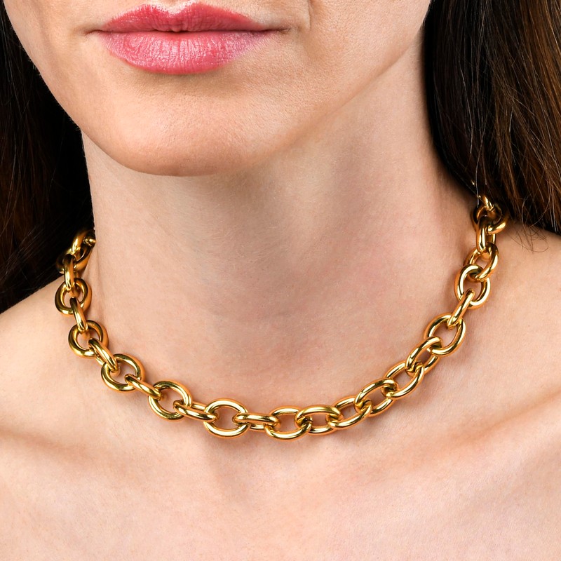 - Gold plated necklace for women with 15 mm x 12 mm wide oval links. 18-inch long necklace with a round spring lock.