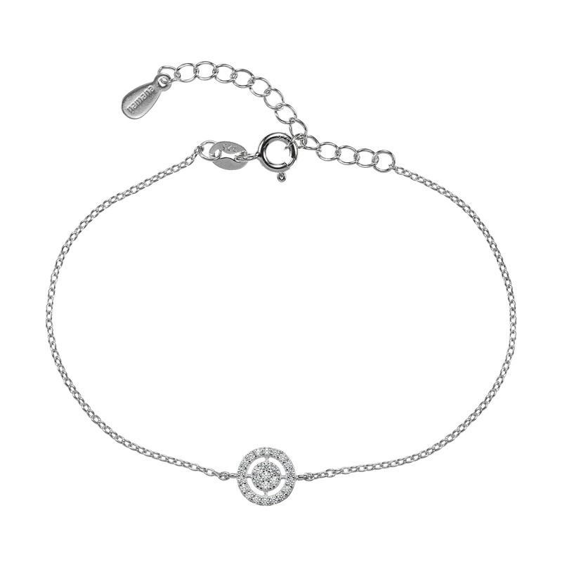 - Dainty Halo Sterling Silver bracelet on a delicate trace chain. 8mm round disc motif encrusted with AAA Cubic Zirconia