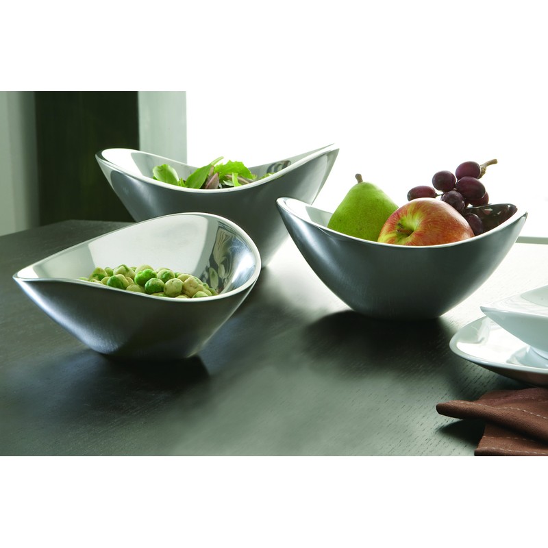 One of Nambé's earliest designs, the elegant Butterfly bowl continues to be an enduring bestseller. A graceful swoop in the rim of the asymmetrical, elongated bowl brings to mind the fluid motion of a butterfly in flight. Solid and heavy, in a variety of sizes, the metal alloy bowl adorns any end table or shelf as an art piece, yet may be used to serve food as well. One of the medium sizes, this seven-inch, 16-ounce-capacity bowl works beautifully for serving anything from chilled fruit salad to party snacks to hot side dishes at the dinner table. Excellent at retaining cold and heat, all metal Nambé bowls may safely go in the refrigerator or freezer for chilling, and in the oven for warming, but not, however, in a microwave or dishwasher. Washing by hand will preserve the gleaming finish.