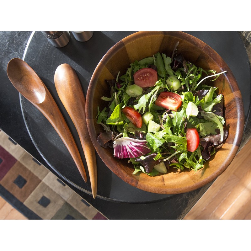 - PRODUCT SPECIFICATIONS: Package contains (1) Nambe Gourmet Harmony 3 Piece Wooden Salad Set. Mid Century Modern Decor Style. Made of Acacia Wood. Bowl measures 12 inches long X 11.5 inches wide X 6 inches high. Servers measure 12 inches long. Hand wash; dry immediately. Designed by Wei Young.