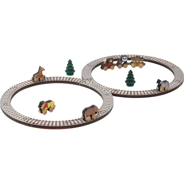 Create your own wild Safari. Our medium-size NameTrain set has 26 pieces. Includes: figure-8 track (12 curved pieces, 4 six-inch straight pieces, 1 crossover) measuring 17" X 39", tiger train engine, giraffe, lion, elephant, zebra, panda, leopard caboose, and 2 trees.