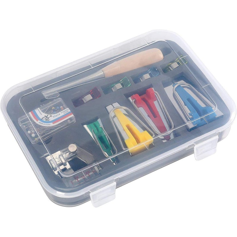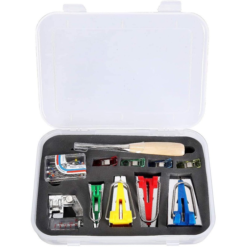 - Complete bias binding set --- This bias binding set in 4 sizes, including 6mm, 12mm, 18mm, 25mm binding maker, four throwing clips, a wooden awl, 50 pieces beading needles and an adjustable bias tape foot that meets your needs for making bias tapes.