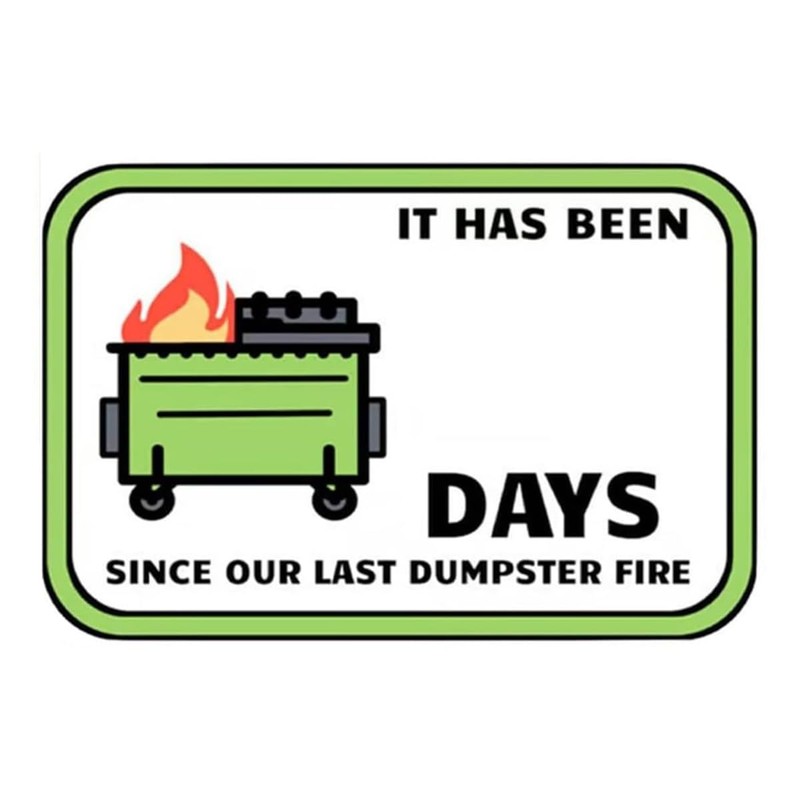 - Our Dumpster Fire Day Count sticker is made of paper and can withstand various environmental conditions. It does not fade and is wear-resistant, so it is highly visible and effectively promotes awareness of fire protection in different environments.