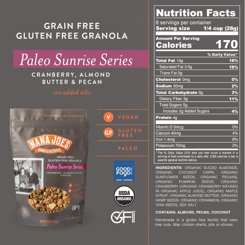 - CRANBERRY, ALMOND BUTTER & PECAN: Tart cranberries, sweet coconut, and warming cinnamon make this blend a perfect grain free breakfast! Straight out of the bag, mixed into a smoothie or over a bowl of yogurt the Paleo Sunrise Series; Cranberry, Almond Butter, Pecan is a great way to start your day.