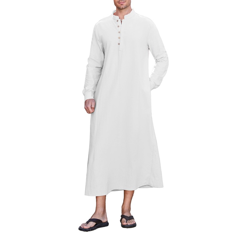 NANAMEEI Linen Thobe for Men Islamic Clothing Long Sleeve Abaya Thobe Button Up,White,L