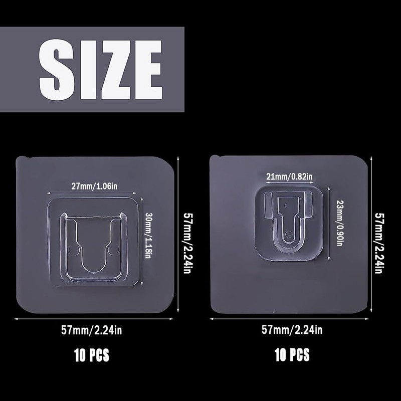 - Package: You will receive 10 pairs 20pcs wall hooks adhesive in a package, their size is about 2.2 x 2.2 inches / 57x 57 mm