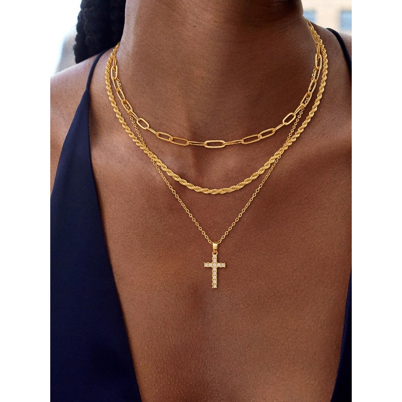 - Gold Necklace Set:This cross necklace is made of three layers of chains stacked in different styles: figaro chain, paperclip chain, and twisted rope chain. This diamond encrusted pendant will not only add a touch of timeless beauty for you, but is also a radiant symbol of faith and trendy