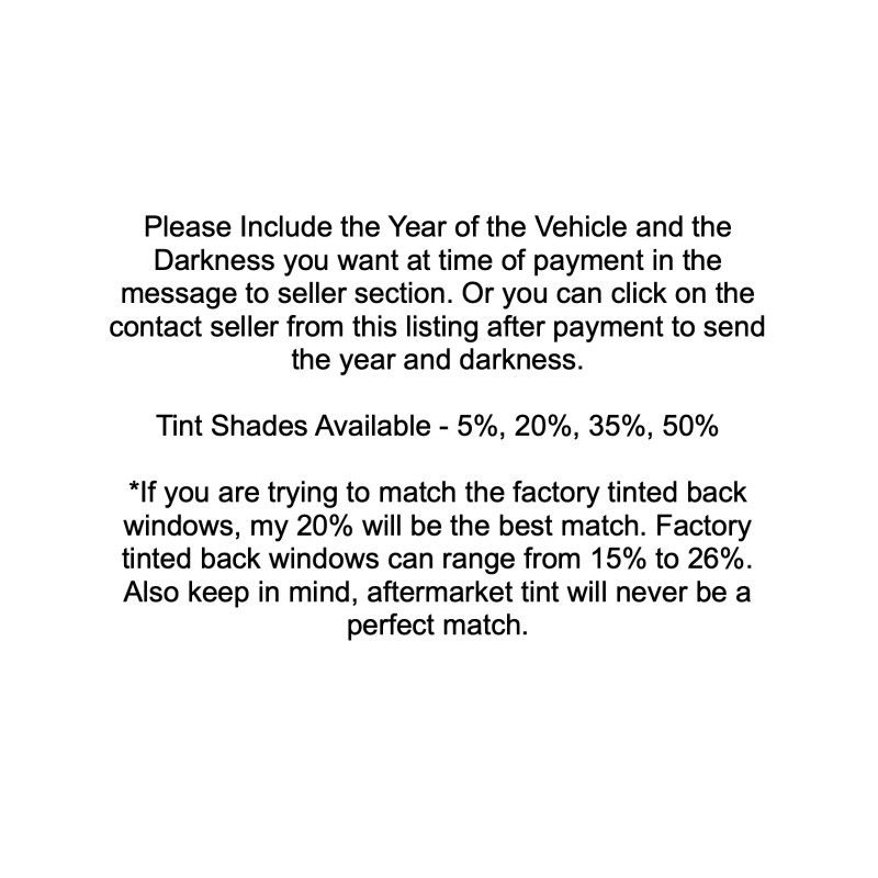 Please Include the Year of the Vehicle and the Darkness you want at time of payment in the message to seller section. Or you can click on the contact seller from this listing after payment to send the year and darkness.