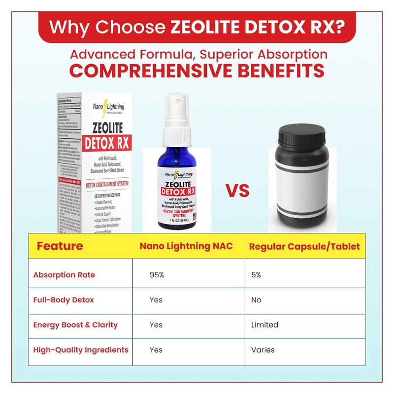 Unleash the Power of Detoxification with Zeolite Detox Rx Introducing Zeolite Detox Rx, the pinnacle of advanced detox supplements designed to revolutionize your body's purification process. Leveraging the most cutting-edge nanotechnology, this innovative detox formula offers a transformative approach to cleansing, setting a new standard in detoxification. Cutting-Edge Nanotechnology for Superior Absorption At the heart of Zeolite Detox Rx is our groundbreaking use of nanotechnology. This advanced technology breaks down the key ingredients into nanoparticles, significantly enhancing their absorption and bioavailability within your body. By reducing the particle size to the nano scale, we ensure that the active components of our detox formula are delivered more efficiently and effectively to where they are needed most. This results in unparalleled detoxification outcomes and a more profound impact on your overall health and well-being. Pure and Potent Formula We source only the finest raw materials for Zeolite Detox Rx, ensuring that each ingredient meets the highest standards of purity and potency. The detoxifying properties of zeolite are maximized through our innovative formulation, which enhances its natural ability to bind and eliminate toxins from your body. This meticulous attention to quality guarantees a detox experience that is both effective and gentle, helping you achieve optimal results without compromising your health. Comprehensive Detoxification Zeolite Detox Rx is designed to address a wide range of detoxification needs. By targeting and neutralizing harmful toxins and impurities, it supports the body's natural detoxification processes, helping to cleanse the digestive system, boost liver function, and enhance overall vitality. This comprehensive approach ensures that every aspect of your body's detox needs is addressed, promoting a deeper and more thorough cleanse. Renewed Vitality and Well-Being Embrace a renewed sense of vitality and well-being with Zeolite Detox Rx. As you eliminate accumulated toxins and impurities, you'll experience a noticeable boost in energy, improved mental clarity, and enhanced physical performance. Our detox formula is designed to rejuvenate your body from the inside out, helping you feel more vibrant, balanced, and revitalized. The Ultimate Detox Solution With its unmatched purity, advanced nanotechnology, and potent formulation, Zeolite Detox Rx stands out as the ultimate solution for those seeking a comprehensive and effective detoxification experience. Whether you are looking to kickstart a new health regimen, support ongoing wellness, or simply cleanse your system, Zeolite Detox Rx provides a powerful and transformative tool to help you achieve your health goals. Embark on Your Transformative Journey Join countless others who have experienced the remarkable benefits of Zeolite Detox Rx. Embark on a transformative journey towards optimal health and radiant vitality with our revolutionary detox powerhouse. Discover the difference that advanced technology and superior ingredients can make, and take the first step towards a healthier, more vibrant you.