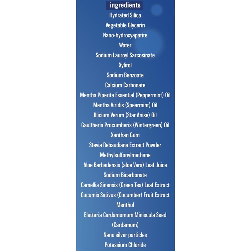 • Nano Silver - potent antibaterial defense against S. Mutans and other decay causing bacteria. Helps maintain a healthier oral microbiome by preventing plaque and biofilm formation.