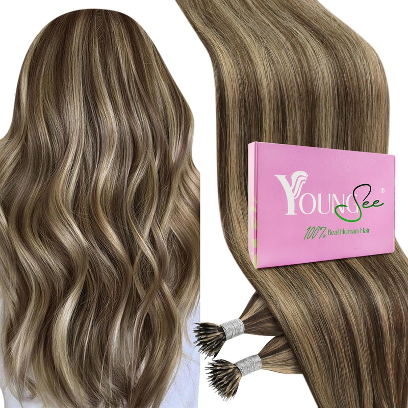 Nano Ring Hair Extensions,YoungSee Nano Extensions Human Hair Brown Highlight Nano Tip Extensions Dark Brown and Caramel Blonde Highlight Nano Beads Human Hair Extensions Cold Fusion 16 in 1g/s 50g