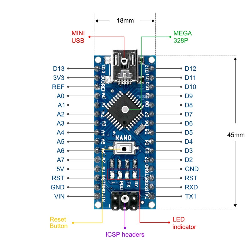 - LAFVIN Nano CH340 controller is a compact board similar to the R3 board, smaller and breadboard-friendly than Diecimila.