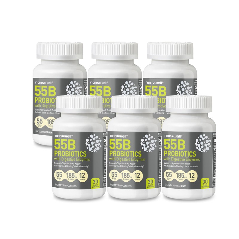 NANOWELL 55B Probiotics with Digestive Enzymes for Immune Support & Gut Health - 55 Billion CFU, 12 Strain, 185 mg Prebiotic - Relieves Gas & Bloating - 30 Vegan Capsules x 6 Bottles (180 Count)